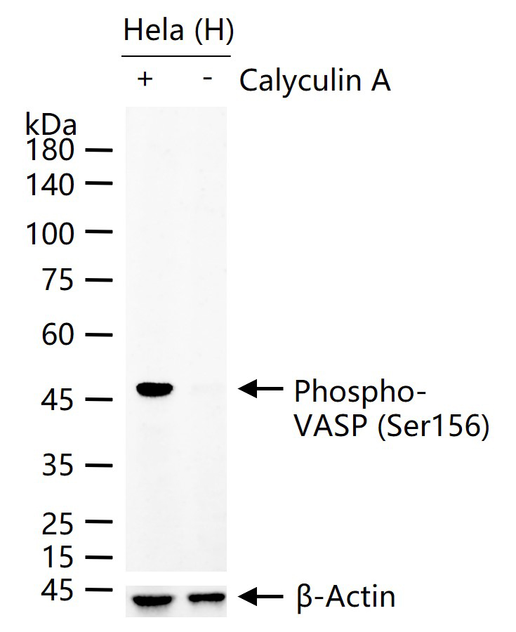 Hela (H) cells were treated with or without Calyculin A (100ng/mL) for 30 min, 25 μg total protein per lane of cell lysates (see on figure) probed with Phospho-VASP (Ser156) monoclonal antibody, unconjugated (bsm-63018R) at 1:1000 dilution and 4°C overnight incubation. Followed by conjugated secondary antibody incubation at r.t. for 60 min.