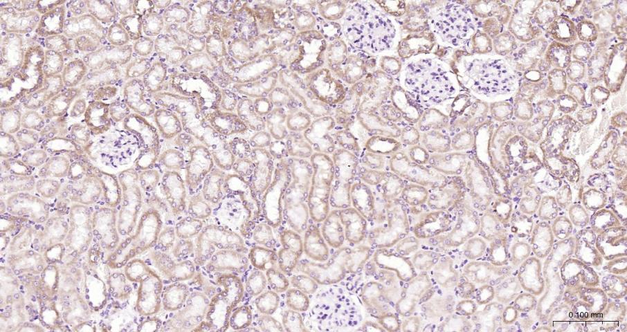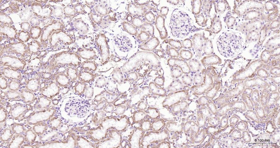 Paraformaldehyde-fixed, paraffin embedded Mouse Kidney; Antigen retrieval by boiling in sodium citrate buffer (pH6.0) for 15 min; The section was incubated with Cytochrome C Polyclonal Antibody, Unconjugated (bs-0013R) at 1:200 overnight at 4°C, followed by conjugation to the bs-0295G-HRP and DAB (C-0010) staining.