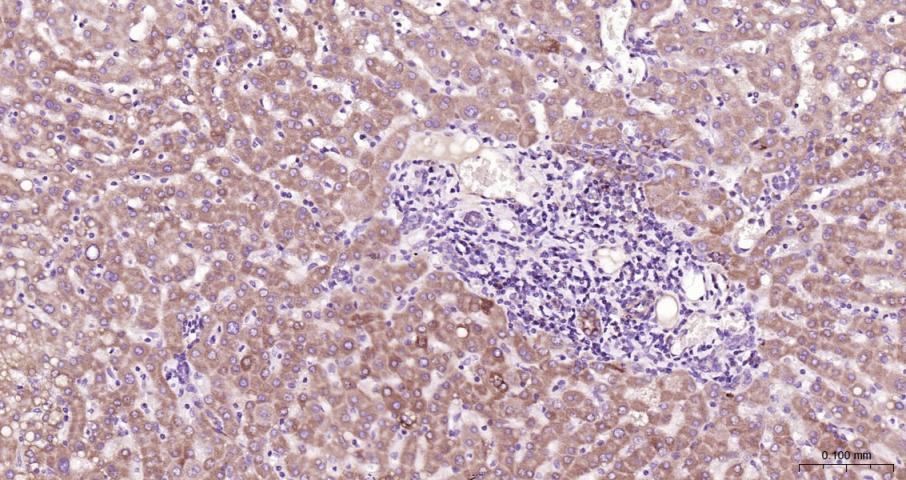 Paraformaldehyde-fixed, paraffin embedded Human Liver; Antigen retrieval by boiling in sodium citrate buffer (pH6.0) for 15 min; The section was incubated with Cytochrome C Polyclonal Antibody, Unconjugated (bs-0013R) at 1:200 overnight at 4°C, followed by conjugation to the bs-0295G-HRP and DAB (C-0010) staining.