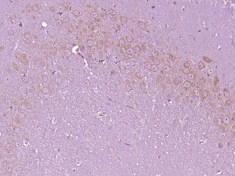 Paraformaldehyde-fixed, paraffin embedded (Rat brain); Antigen retrieval by boiling in sodium citrate buffer (pH6.0) for 15min; Block endogenous peroxidase by 3% hydrogen peroxide for 20 minutes; Blocking buffer (normal goat serum) at 37°C for 30min; Antibody incubation with (DTNBP1) Polyclonal Antibody, Unconjugated (bs-1561R) at 1:400 overnight at 4°C, followed by operating according to SP Kit(Rabbit) (sp-0023) instructionsand DAB staining.