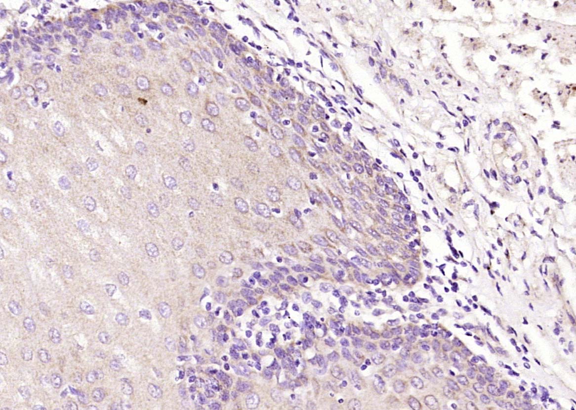 Paraformaldehyde-fixed, paraffin embedded (Human esophageal); Antigen retrieval by boiling in sodium citrate buffer (pH6.0) for 15min; Block endogenous peroxidase by 3% hydrogen peroxide for 20 minutes; Blocking buffer (normal goat serum) at 37°C for 30min; Antibody incubation with (SPINK7) Polyclonal Antibody, Unconjugated (bs-0500R) at 1:400 overnight at 4°C, followed by operating according to SP Kit(Rabbit) (sp-0023) instructionsand DAB staining.