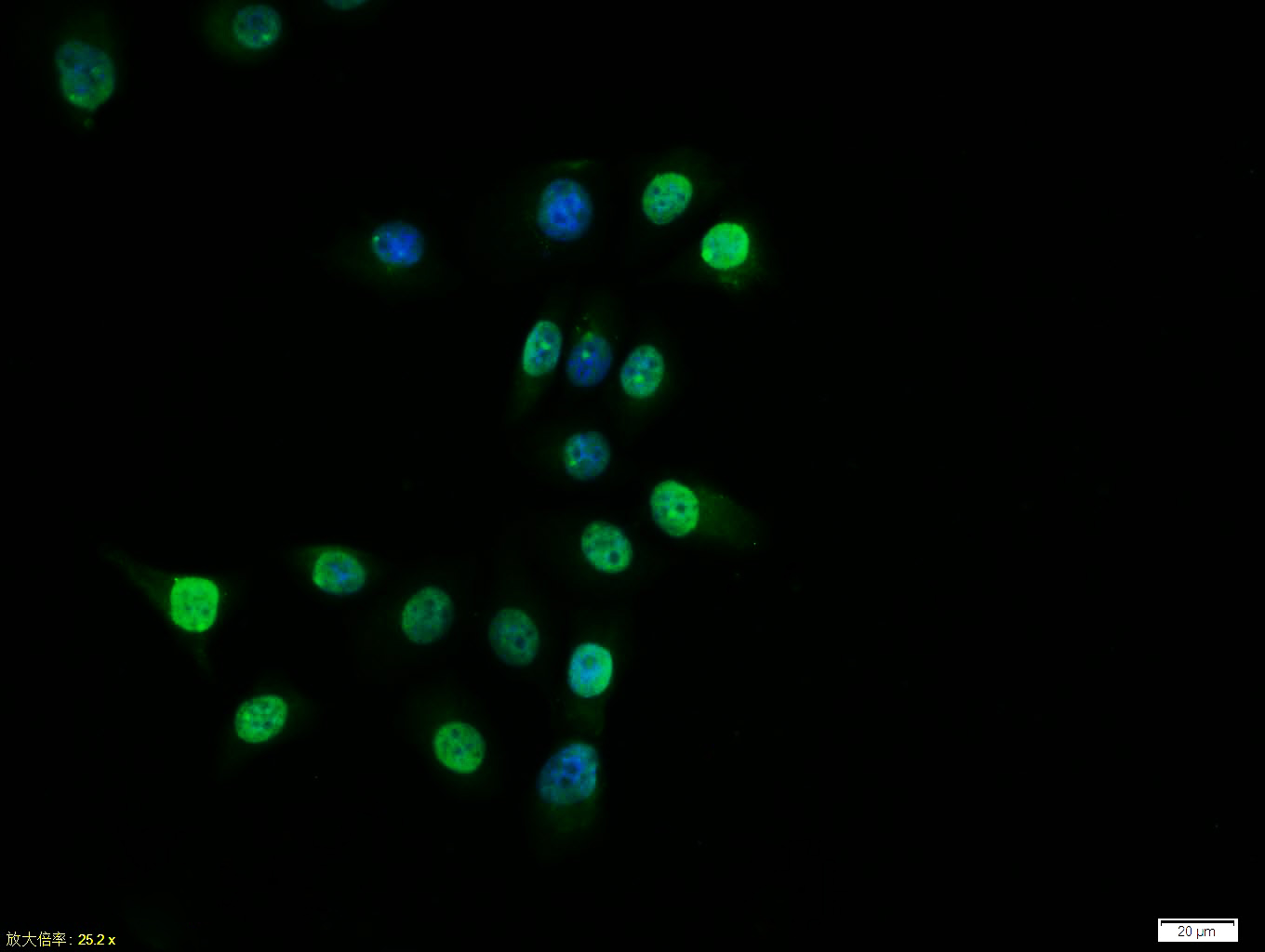 Tissue/cell:MCF7 cell; 4% Paraformaldehyde-fixed; Triton X-100 at room temperature for 20 min; Blocking buffer (normal goat serum, C-0005) at 37°C for 20 min; Antibody incubation with (Estrogen Receptor alpha) polyclonal Antibody, Unconjugated (bs-0725R) 1:100, 90 minutes at 37°C; followed by a FITC conjugated Goat Anti-Rabbit IgG antibody at 37°C for 90 minutes, DAPI (blue, C02-04002) was used to stain the cell nuclei.