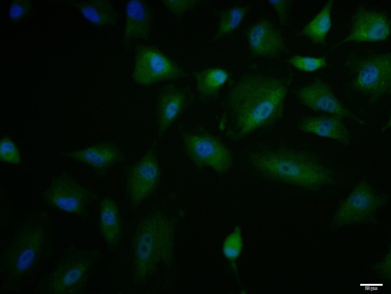 A549 cell; 4% Paraformaldehyde-fixed; Triton X-100 at room temperature for 20 min; Blocking buffer (normal goat serum, C-0005) at 37°C for 20 min; Antibody incubation with (IL-15) polyclonal Antibody, Unconjugated (bs-1829R) 1:100, 90 minutes at 37°C; followed by a conjugated Goat Anti-Rabbit IgG antibody at 37°C for 90 minutes, DAPI (blue, C02-04002) was used to stain the cell nuclei.