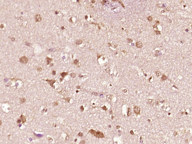 Paraformaldehyde-fixed, paraffin embedded Rat Cerebrum; Antigen retrieval by boiling in sodium citrate buffer (pH6.0) for 15 min; Antibody incubation with MAGE-1 Polyclonal Antibody, Unconjugated (bs-0817R) at 1:200 overnight at 4°C, followed by conjugation to the SP Kit (Rabbit, SP-0023) and DAB (C-0010) staining.