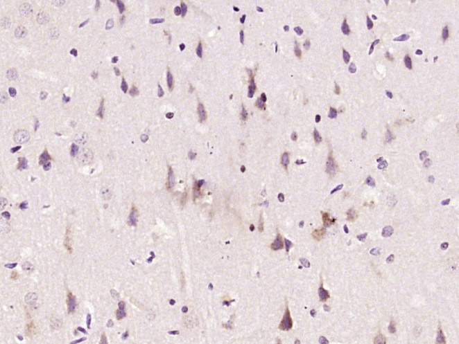 Paraformaldehyde-fixed, paraffin embedded (rat brain tissue); Antigen retrieval by boiling in sodium citrate buffer (pH6.0) for 15min; Block endogenous peroxidase by 3% hydrogen peroxide for 20 minutes; Blocking buffer (normal goat serum) at 37°C for 30min; Antibody incubation with (Nogo-A) Polyclonal Antibody, Unconjugated (bs-0134R) at 1:400 overnight at 4°C, followed by operating according to SP Kit(Rabbit) (sp-0023) instructionsand DAB staining.
