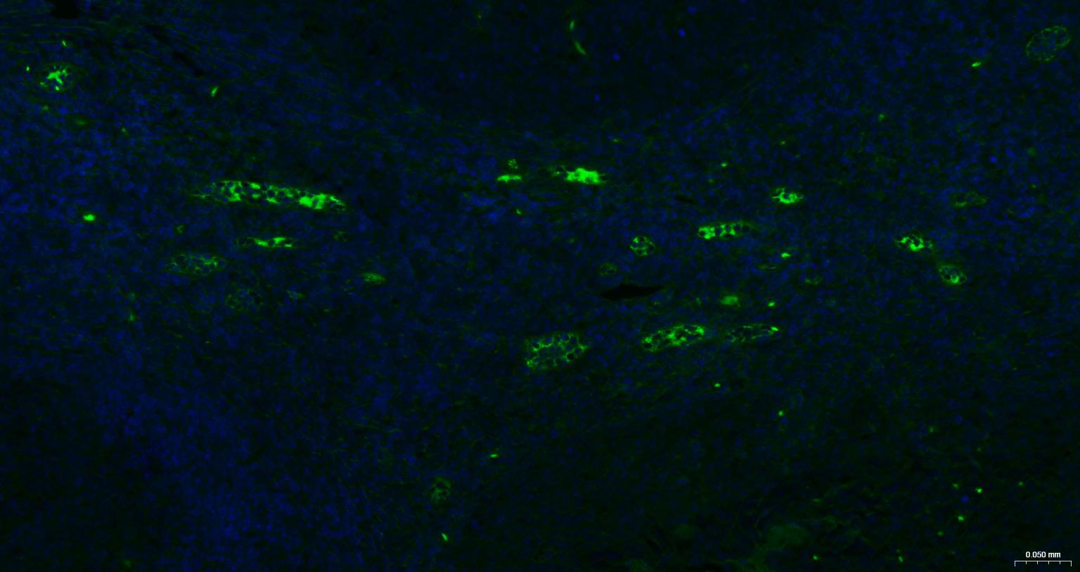 Paraformaldehyde-fixed, paraffin embedded Human Tonsil; Antigen retrieval by boiling in sodium citrate buffer (pH6.0) for 15 min; The section was incubated with CD62p Polyclonal Antibody, Unconjugated (bs-0561R) at 1:200 overnight at 4°C. Followed by conjugated Goat Anti-Rabbit IgG antibody (green, bs-0295G-BF488), DAPI (blue, C02-04002) was used to stain the cell nuclei.