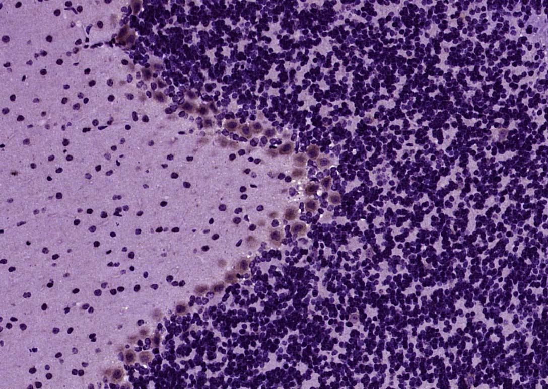 Paraformaldehyde-fixed, paraffin embedded (Mouse cerebellum); Antigen retrieval by boiling in sodium citrate buffer (pH6.0) for 15min; Block endogenous peroxidase by 3% hydrogen peroxide for 20 minutes; Blocking buffer (normal goat serum) at 37°C for 30min; Antibody incubation with (Tenascin C) Polyclonal Antibody, Unconjugated (bs-1327R) at 1:400 overnight at 4°C, followed by operating according to SP Kit(Rabbit) (sp-0023) instructionsand DAB staining.