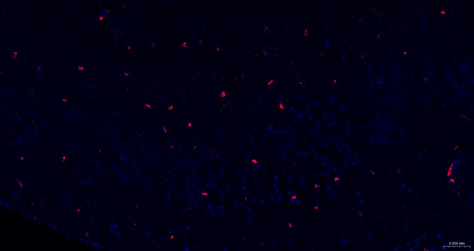 Paraformaldehyde-fixed, paraffin embedded Mouse Cerebrum; Antigen retrieval by boiling in sodium citrate buffer (pH6.0) for 15 min; The section was incubated with AIF1 / Iba1 Polyclonal Antibody, Unconjugated (bs-1363R) at 1:200 overnight at 4°C. Followed by conjugated Goat Anti-Rabbit IgG antibody (Red, bs-0295G-BF594), DAPI (blue, C02-04002) was used to stain the cell nuclei.