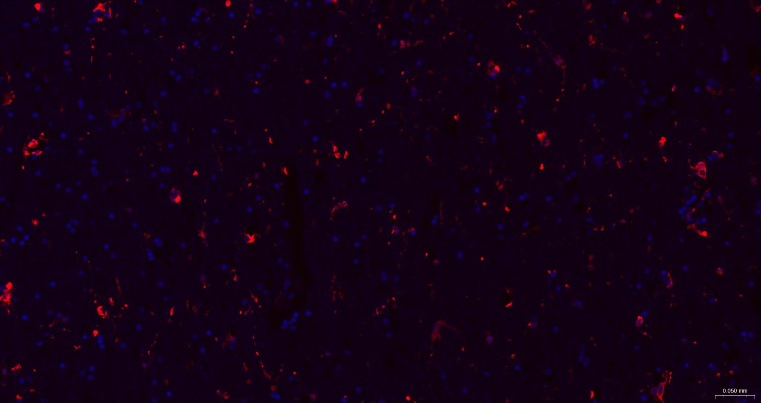 Paraformaldehyde-fixed, paraffin embedded Human Left Parietal Lobe; Antigen retrieval by boiling in sodium citrate buffer (pH6.0) for 15 min; The section was incubated with AIF1 / Iba1 Polyclonal Antibody, Unconjugated (bs-1363R) at 1:200 overnight at 4°C. Followed by conjugated Goat Anti-Rabbit IgG antibody (Red, bs-0295G-BF594), DAPI (blue, C02-04002) was used to stain the cell nuclei.