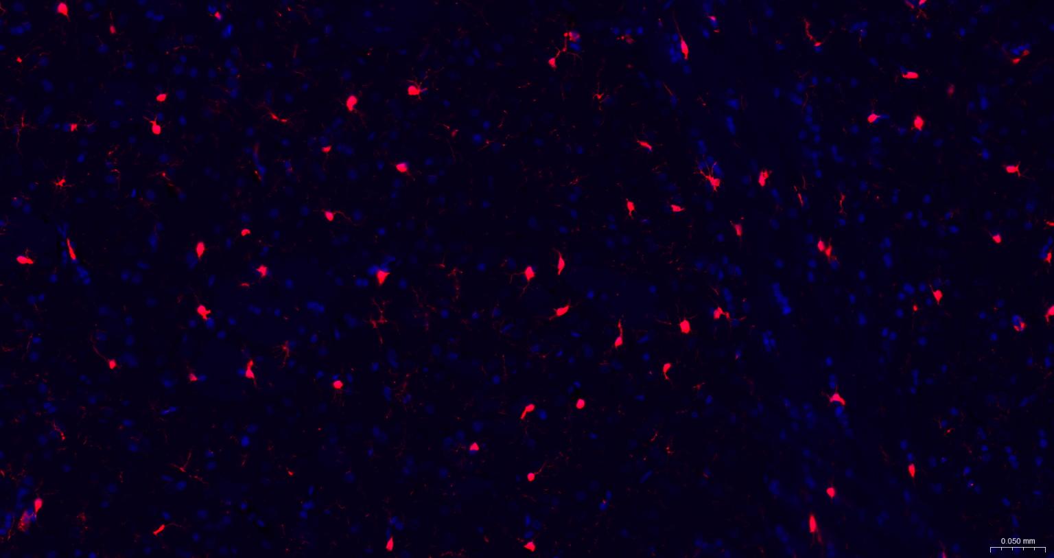 Paraformaldehyde-fixed, paraffin embedded Rat Cerebrum; Antigen retrieval by boiling in sodium citrate buffer (pH6.0) for 15 min; The section was incubated with AIF1 / Iba1 Polyclonal Antibody, Unconjugated (bs-1363R) at 1:200 overnight at 4°C. Followed by conjugated Goat Anti-Rabbit IgG antibody (Red, bs-0295G-BF594), DAPI (blue, C02-04002) was used to stain the cell nuclei.