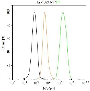 The SH-SY5Y (H) cells were fixed with 4% PFA (10 min at r.t.) and then permeabilized with 90% ice-cold methanol for 20 min at -20℃,the cells then were incubated in 5%BSA to block non-specific protein-protein interactions (30 min at r.t.), followed by secondary antibody incubation for 40 min at room temperature. Primary Antibody (green):Rabbit Anti-MAP2 antibody (bs-1369R): 1 μg/10^6 cells; Isotype Control (orange): Rabbit IgG (bs-0295P). Blank control (black): PBS. Acquisition of 20,000 events was performed.