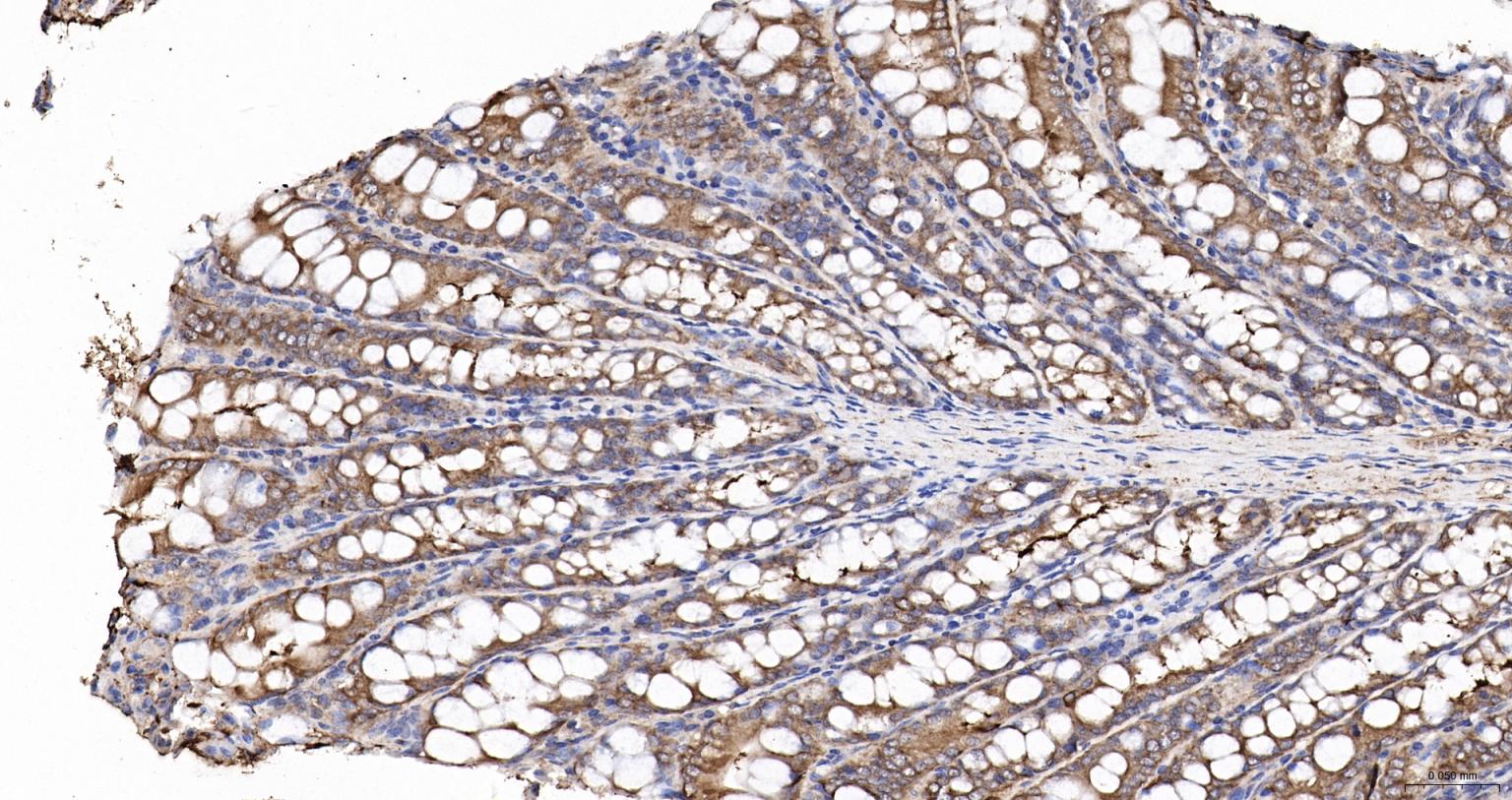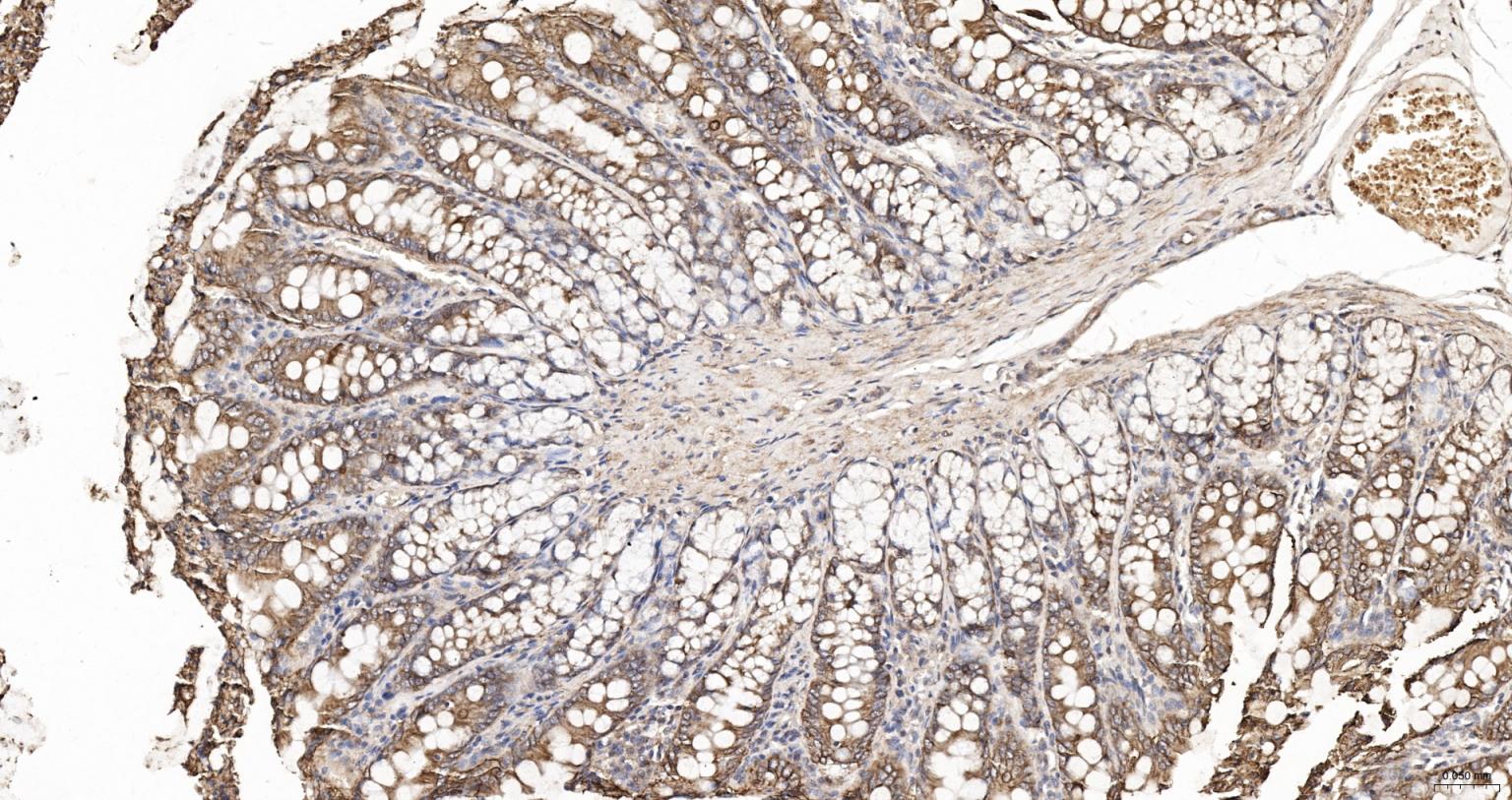 Paraformaldehyde-fixed, paraffin embedded Mouse Colon; Antigen retrieval by boiling in sodium citrate buffer (pH6.0) for 15 min; The section was incubated with CK18 Polyclonal Antibody, Unconjugated (bs-1339R) at 1:200 overnight at 4°C, followed by conjugation to the bs-0295G-HRP and DAB (C-0010) staining.
