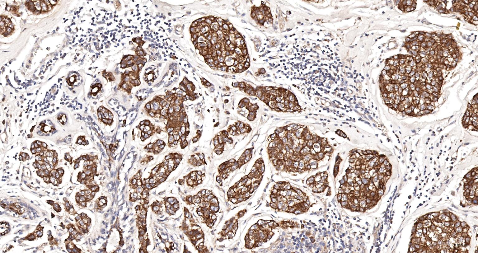 Paraformaldehyde-fixed, paraffin embedded Human Breast Cancer; Antigen retrieval by boiling in sodium citrate buffer (pH6.0) for 15 min; The section was incubated with CK18 Polyclonal Antibody, Unconjugated (bs-1339R) at 1:200 overnight at 4°C, followed by conjugation to the bs-0295G-HRP and DAB (C-0010) staining.
