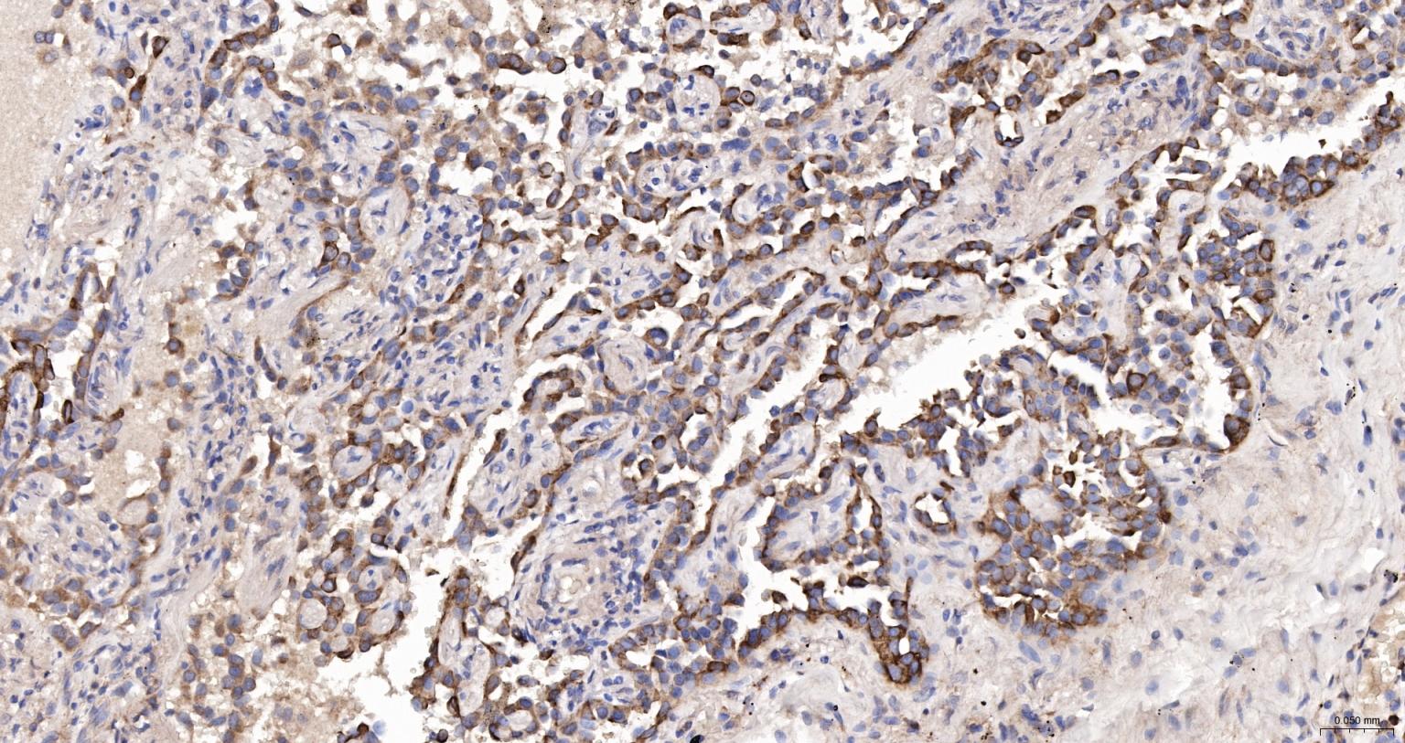 Paraformaldehyde-fixed, paraffin embedded Human Lung Cancer; Antigen retrieval by boiling in sodium citrate buffer (pH6.0) for 15 min; The section was incubated with CK18 Polyclonal Antibody, Unconjugated (bs-1339R) at 1:200 overnight at 4°C, followed by conjugation to the bs-0295G-HRP and DAB (C-0010) staining.