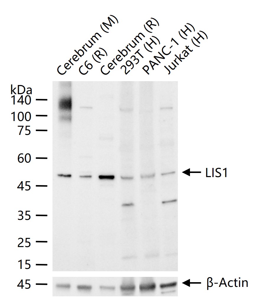 25 ug total protein per lane of various lysates (see on figure) probed with LIS1 polyclonal antibody, unconjugated (bs-2035R) at 1:1000 dilution and 4°C overnight incubation. Followed by conjugated secondary antibody incubation at r.t. for 60 min.