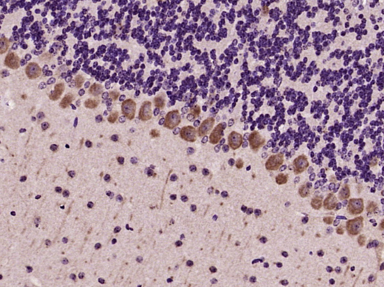Paraformaldehyde-fixed, paraffin embedded (Mouse cerebellum); Antigen retrieval by boiling in sodium citrate buffer (pH6.0) for 15min; Block endogenous peroxidase by 3% hydrogen peroxide for 20 minutes; Blocking buffer (normal goat serum) at 37°C for 30min; Antibody incubation with (GRM1) Polyclonal Antibody, Unconjugated (bs-1803R) at 1:400 overnight at 4°C, followed by operating according to SP Kit(Rabbit) (sp-0023) instructions and DAB staining.