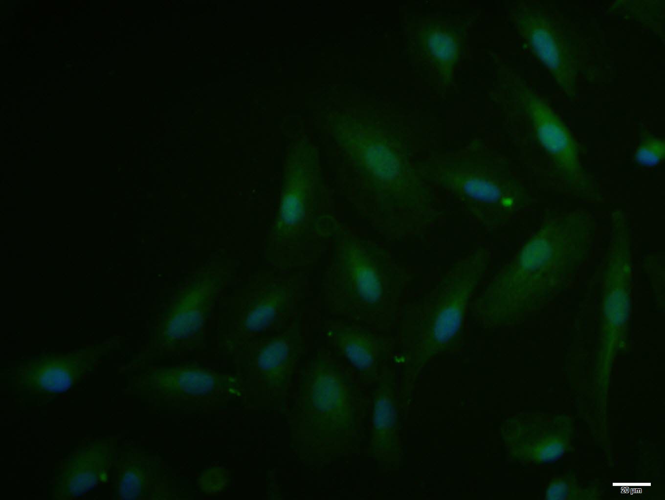A549 cell; 4% Paraformaldehyde-fixed; Triton X-100 at room temperature for 20 min; Blocking buffer (normal goat serum, C-0005) at 37°C for 20 min; Antibody incubation with (TRF2) polyclonal Antibody, Unconjugated (bs-1922R) 1:100, 90 minutes at 37°C; followed by a conjugated Goat Anti-Rabbit IgG antibody at 37°C for 90 minutes, DAPI (blue, C02-04002) was used to stain the cell nuclei.