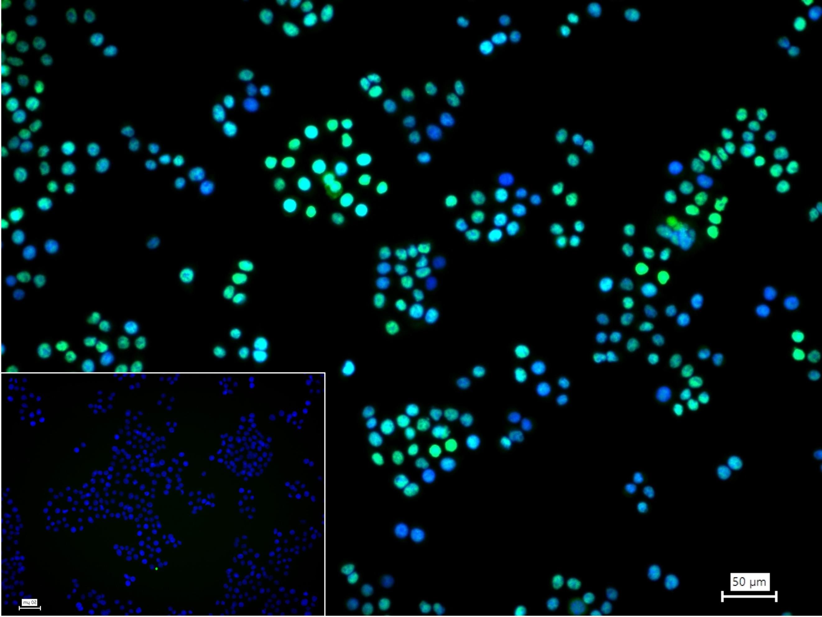 4% Paraformaldehyde-fixed HT-29 (H) cell; Triton X-100 at r.t. for 20 min; Antibody incubation with (P53) polyclonal Antibody, unconjugated (bs-2090R) 1:100, 90 min at 37°C; followed by BF488 conjugated Goat Anti-Rabbit IgG antibody (green, bs-60295G-BF488) at 37°C for 90 min, DAPI (blue, C02-04002) was used to stain the cell nuclei. PBS instead of the primary antibody was used as the blank control.