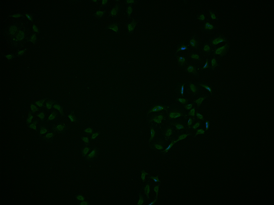 Hela cell; 4% Paraformaldehyde-fixed; Triton X-100 at room temperature for 20 min; Blocking buffer (normal goat serum, C-0005) at 37°C for 20 min; Antibody incubation with (AIMP2) polyclonal Antibody, Unconjugated (bs-2509R) 1:25, 90 minutes at 37°C; followed by a conjugated Goat Anti-Rabbit IgG antibody at 37°C for 90 minutes, DAPI (blue, C02-04002) was used to stain the cell nuclei.