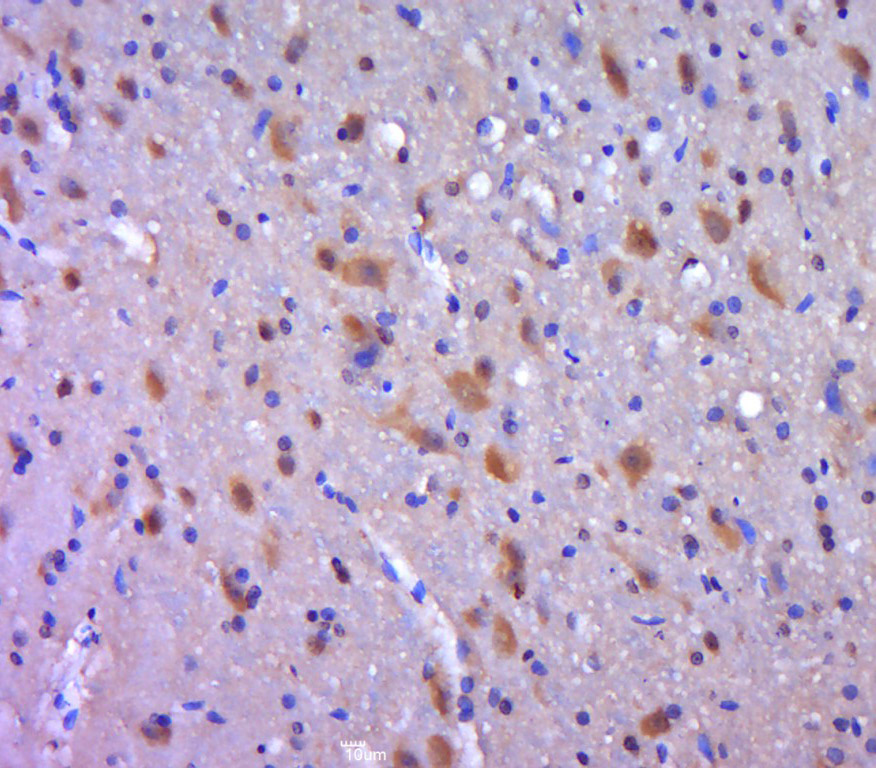 Paraformaldehyde-fixed, paraffin embedded (rat brain tissue); Antigen retrieval by boiling in sodium citrate buffer (pH6.0) for 15min; Block endogenous peroxidase by 3% hydrogen peroxide for 20 minutes; Blocking buffer (normal goat serum) at 37°C for 30min; Antibody incubation with (AIMP2) Polyclonal Antibody, Unconjugated (bs-2509R) at 1:400 overnight at 4°C, followed by a conjugated secondary (sp-0023) for 20 minutes and DAB staining.