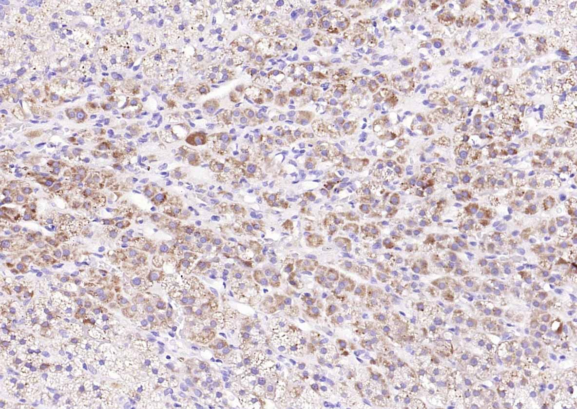 Paraformaldehyde-fixed, paraffin embedded (human adrenal gland); Antigen retrieval by boiling in sodium citrate buffer (pH6.0) for 15min; Block endogenous peroxidase by 3% hydrogen peroxide for 20 minutes; Blocking buffer (normal goat serum) at 37°C for 30min; Incubation with (PENK) Polyclonal Antibody, Unconjugated (bs-2106R) at 1:200 overnight at 4°C, followed by operating according to SP Kit(Rabbit) (sp-0023) instructionsand DAB staining.