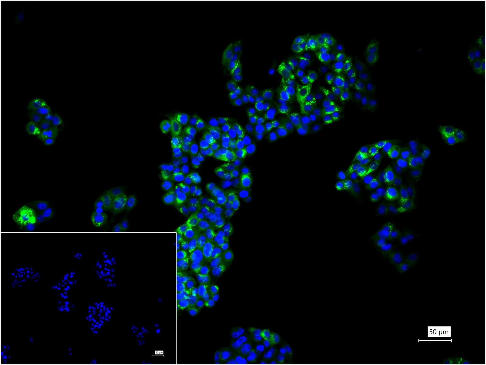4% Paraformaldehyde-fixed HepG2 (H) cell; Triton X-100 at r.t. for 20 min; Antibody incubation with (human Fibrinogen) polyclonal Antibody, unconjugated (bs-1240R) 1:100, 90 min at 37°C; followed by BF488 conjugated Goat Anti-Rabbit IgG antibody (green, bs-60295G-BF488) at 37°C for 90 min, DAPI (blue, C02-04002) was used to stain the cell nuclei. PBS instead of the primary antibody was used as the blank control.