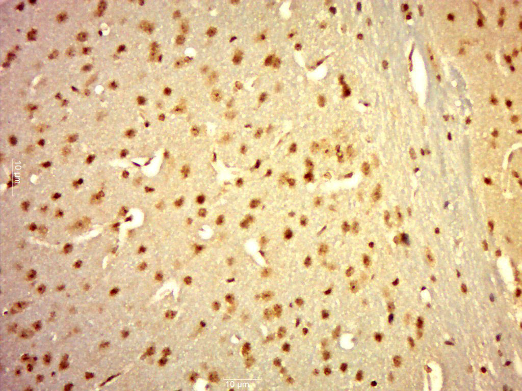 Paraformaldehyde-fixed, paraffin embedded (Rat brain); Antigen retrieval by boiling in sodium citrate buffer (pH6.0) for 15min; Block endogenous peroxidase by 3% hydrogen peroxide for 20 minutes; Blocking buffer (normal goat serum) at 37°C for 30min; Antibody incubation with (TIF1 gamma ) Polyclonal Antibody, Unconjugated (bs-3582R) at 1:500 overnight at 4°C, followed by a conjugated secondary (sp-0023) for 20 minutes and DAB staining.