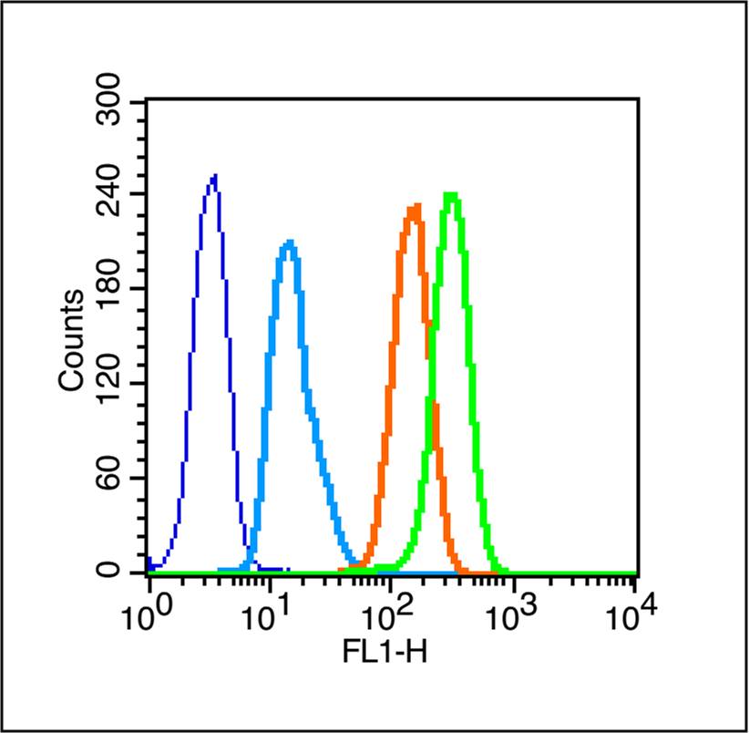 Secondary Antibody (white blue line): F(ab’)2 fragment goat anti-rabbit IgG-FITC;Dilution: 1μg /test.