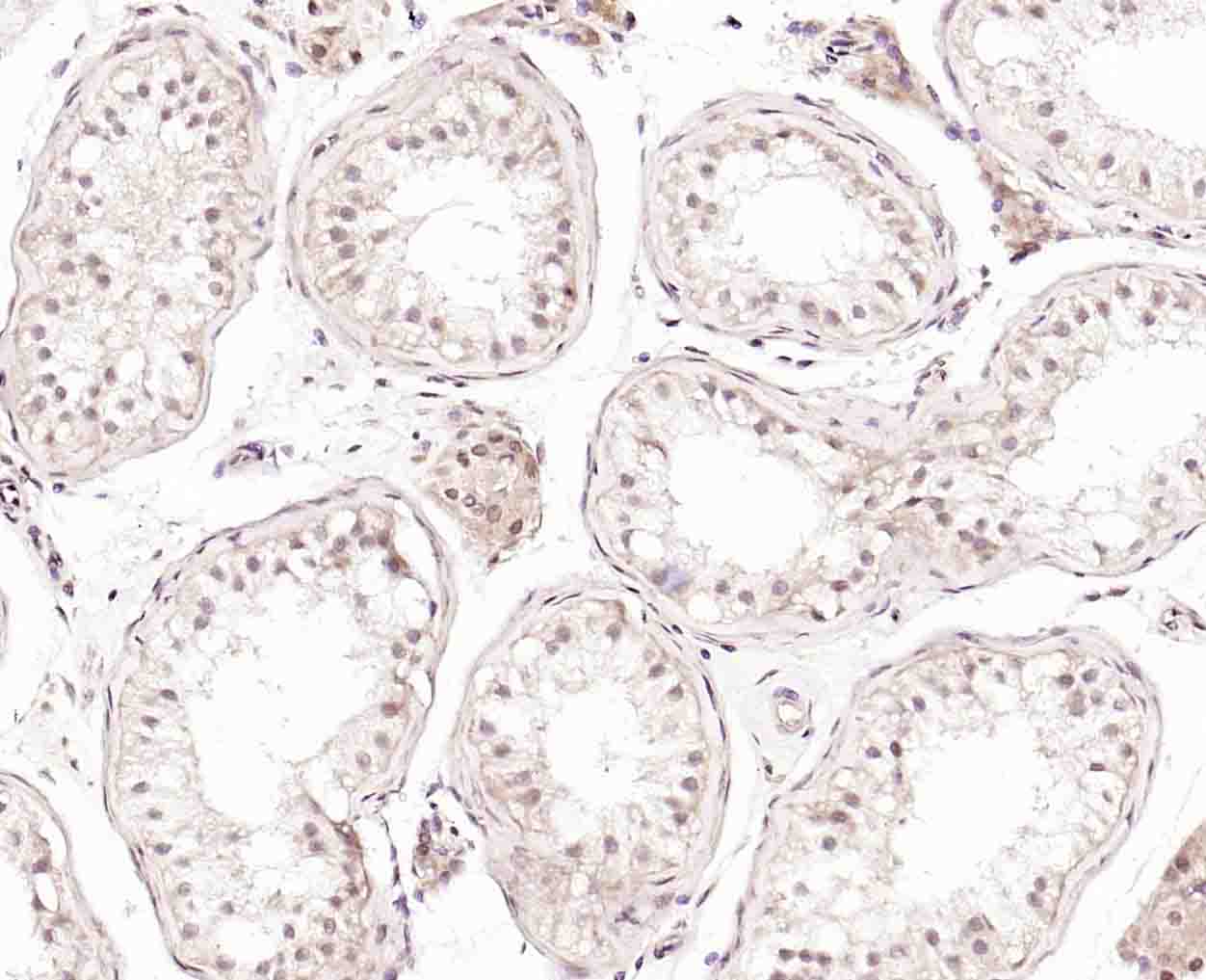 Paraformaldehyde-fixed, paraffin embedded (human testis); Antigen retrieval by boiling in sodium citrate buffer (pH6.0) for 15min; Block endogenous peroxidase by 3% hydrogen peroxide for 20 minutes; Blocking buffer (normal goat serum) at 37°C for 30min; Incubation with (JMJD1B) Polyclonal Antibody, Unconjugated (bs-3824R) at 1:200 overnight at 4°C, followed by operating according to SP Kit(Rabbit) (sp-0023) instructionsand DAB staining.