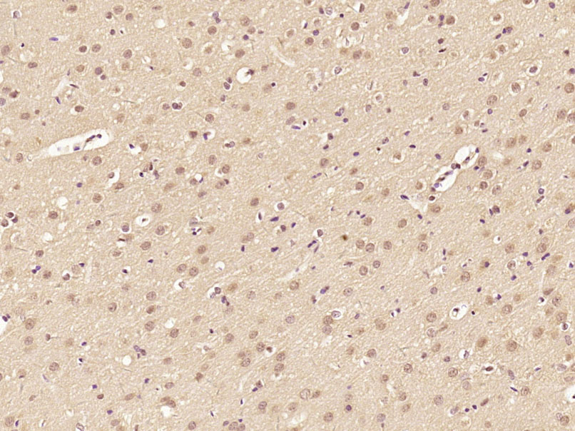 Paraformaldehyde-fixed, paraffin embedded (Rat brain); Antigen retrieval by boiling in sodium citrate buffer (pH6.0) for 15min; Block endogenous peroxidase by 3% hydrogen peroxide for 20 minutes; Blocking buffer (normal goat serum) at 37°C for 30min; Antibody incubation with (JMJD1B) Polyclonal Antibody, Unconjugated (bs-3824R) at 1:400 overnight at 4°C, followed by operating according to SP Kit(Rabbit) (sp-0023) instructionsand DAB staining.