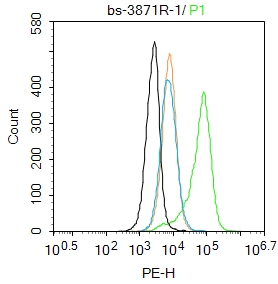 Blank control:U87MG. Primary Antibody (green line): Rabbit Anti-ATG18 antibody (bs-3871R) Dilution: 1μg /10^6 cells; Isotype Control Antibody (orange line): Rabbit IgG . Secondary Antibody : Goat anti-rabbit IgG-PE Dilution: 1μg /test. Protocol The cells were fixed with 4% PFA (10min at room temperature)and then permeabilized with 0.1%PBST for 20 min at room temperature.The cells were then incubated in 5%BSA to block non-specific protein-protein interactions for 30 min at room temperature .Cells stained with Primary Antibody for 30 min at room temperature. The secondary antibody used for 40 min at room temperature. Acquisition of 20,000 events was performed.