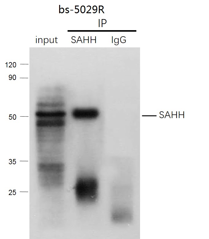 SAHH was immunoprecipitated from mouse kidney tissue with bs-5029R at 1/150 dilution. Western blot was performed from the immunoprecipitate using protein A/G beads. HRP Conjugated Mouse anti-Rabbit IgG (Light Chain specific) was used as secondary antibody at 1:5000 dilution.