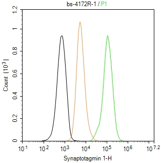 The SH-SY5Y (H) cells were fixed with 4% PFA (10 min at r.t.) and then permeabilized with 90% ice-cold methanol for 20 min at -20℃,the cells then were incubated in 5%BSA to block non-specific protein-protein interactions (30 min at r.t.), followed by secondary antibody incubation for 40 min at room temperature. Primary Antibody (green):Rabbit Anti-Synaptotagmin 1 antibody (bs-4172R): 1 μg/10^6 cells; Isotype Control (orange): Rabbit IgG (bs-0295P). Blank control (black): PBS. Acquisition of 20,000 events was performed.