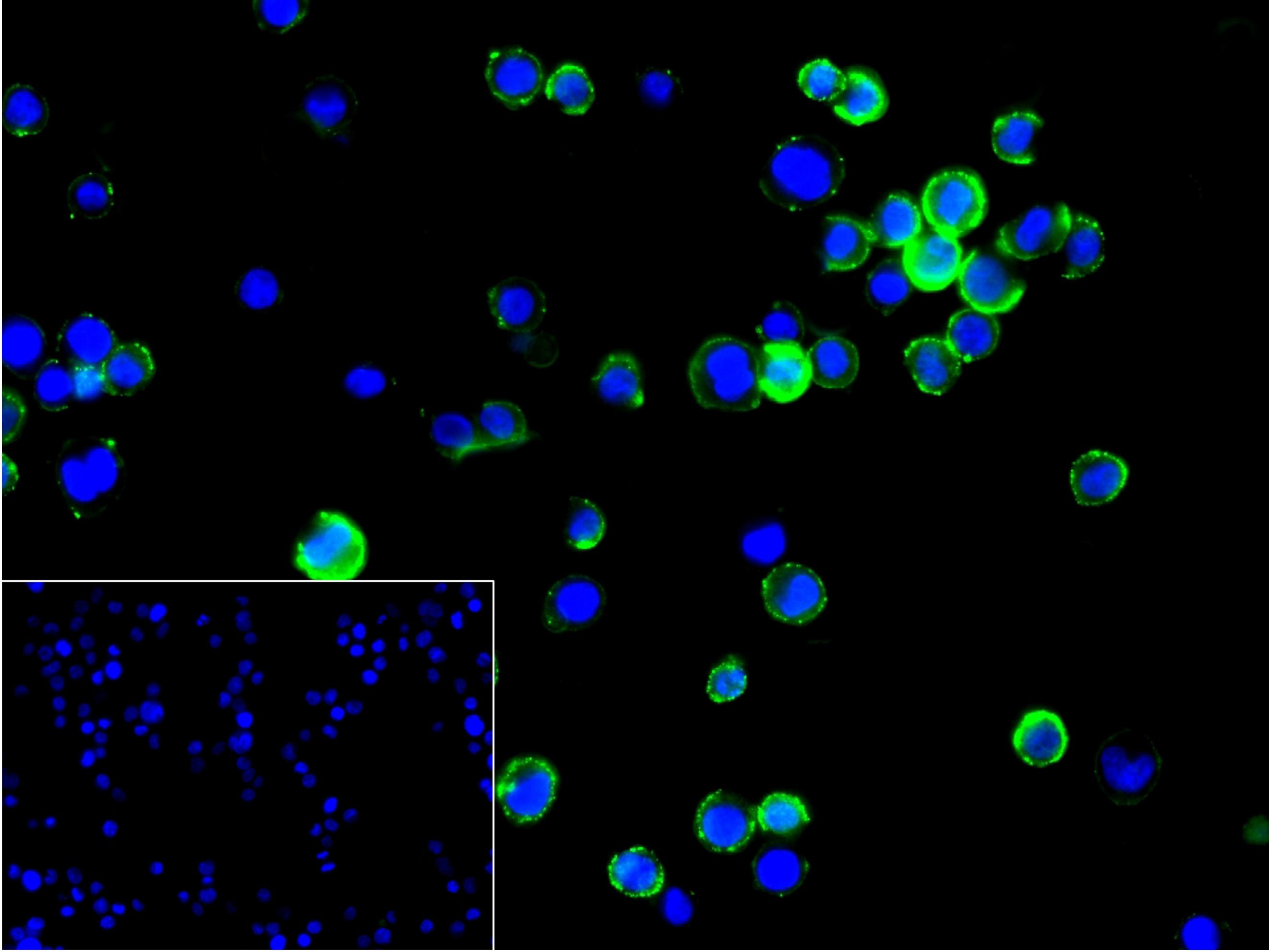4% Paraformaldehyde-fixed Raji (H) cell; Antibody incubation with (ADAM8) polyclonal Antibody, unconjugated (bs-4195R) 1:100, 90 min at 37°C; followed by conjugated Goat Anti-Rabbit IgG antibody (green, bs-60295G-BF488) at 37°C for 90 min, DAPI (blue, C02-04002) was used to stain the cell nuclei. PBS instead of the primary antibody was used as the blank control.