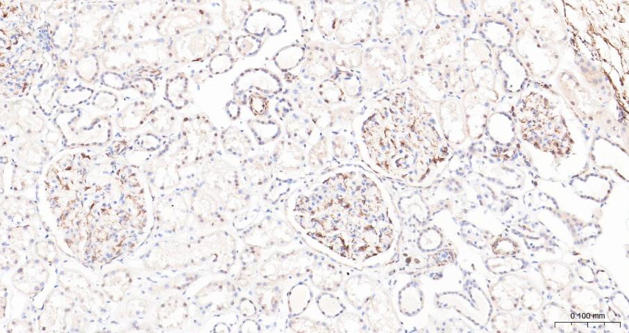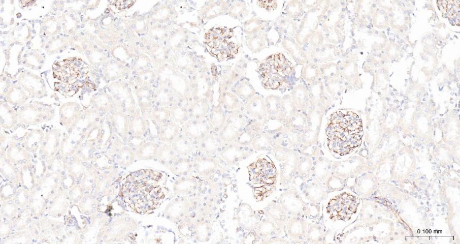 Paraformaldehyde-fixed, paraffin embedded Mouse Kidney; Antigen retrieval by boiling in sodium citrate buffer (pH6.0) for 15 min; Antibody incubation with ADAM17 Polyclonal Antibody, Unconjugated (bs-4236R) at 1:200 overnight at 4°C, followed by conjugation to the bs-0295G-HRP and DAB (C-0010) staining.