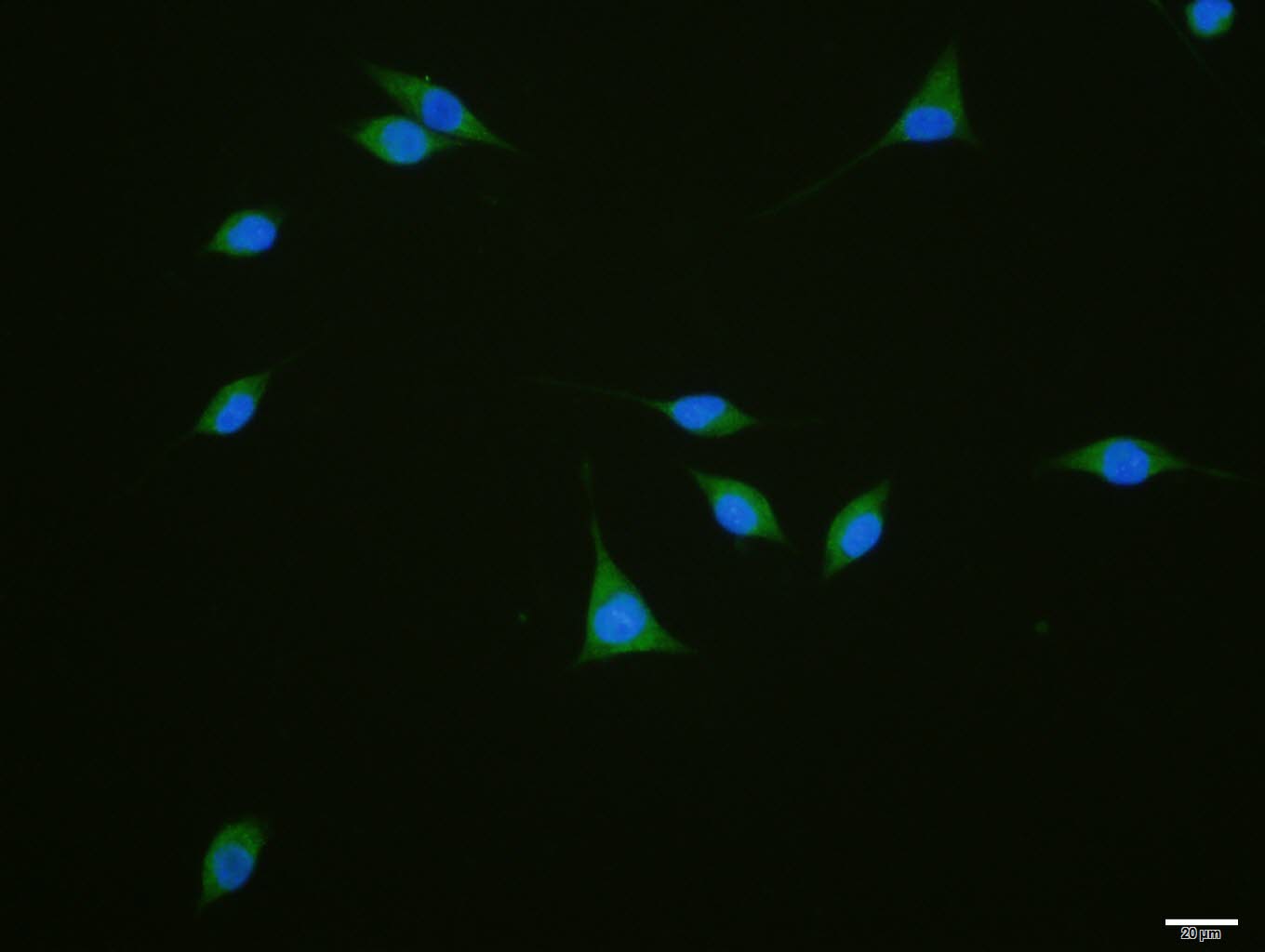 NIH/3T3 cell; 4% Paraformaldehyde-fixed; Triton X-100 at room temperature for 20 min; Blocking buffer (normal goat serum, C-0005) at 37°C for 20 min; Antibody incubation with (GEF H1) polyclonal Antibody, Unconjugated (bs-4202R) 1:100, 90 minutes at 37°C; followed by a conjugated Goat Anti-Rabbit IgG antibody at 37°C for 90 minutes, DAPI (blue, C02-04002) was used to stain the cell nuclei.