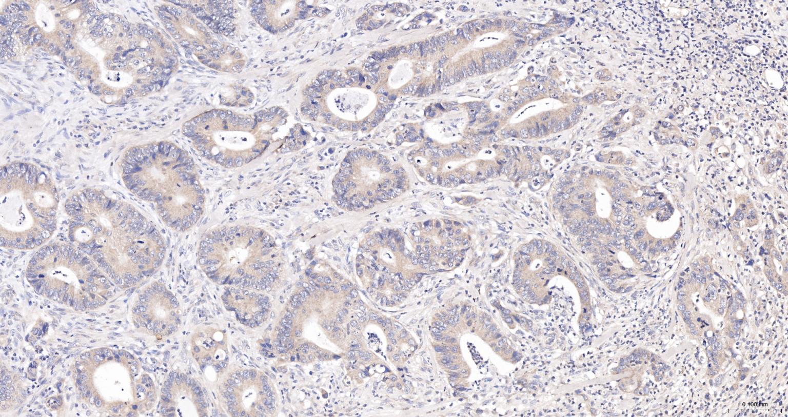 Paraformaldehyde-fixed, paraffin embedded Human Colon Cancer; Antigen retrieval by boiling in sodium citrate buffer (pH6.0) for 15 min; The section was incubated with CAMKK2 Polyclonal Antibody, Unconjugated (bs-6253R) at 1:200 overnight at 4°C, followed by conjugation to the bs-0295G-HRP and DAB (C-0010) staining.