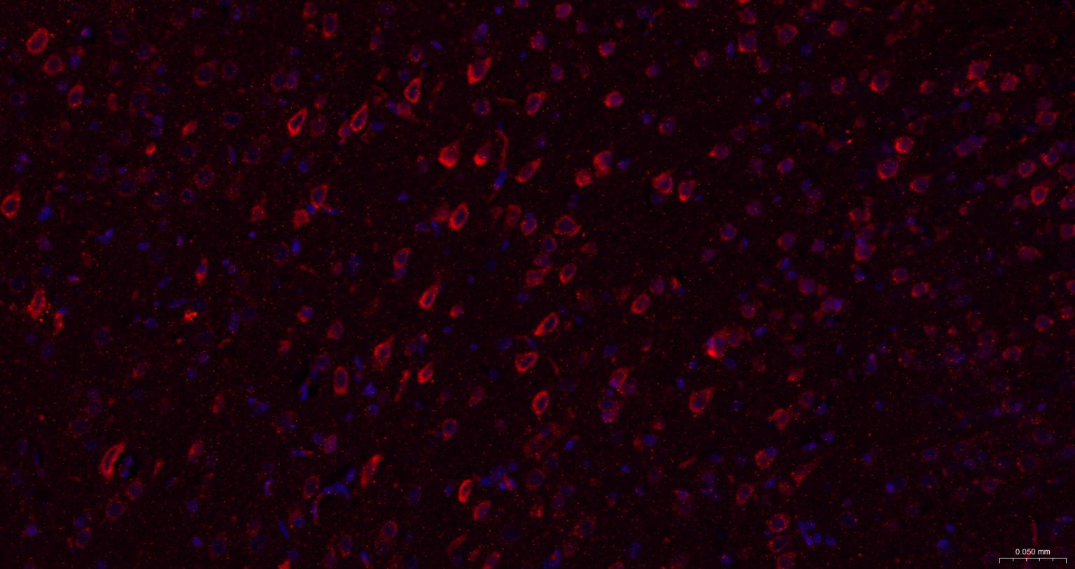Paraformaldehyde-fixed, paraffin embedded Rat Cerebrum; Antigen retrieval by boiling in sodium citrate buffer (pH6.0) for 15 min; The section was incubated with CAMKK2 Polyclonal Antibody, Unconjugated (bs-6253R) at 1:200 overnight at 4°C. Followed by conjugated Goat Anti-Rabbit IgG antibody (Red, bs-0295G-BF594), DAPI (blue, C02-04002) was used to stain the cell nuclei.