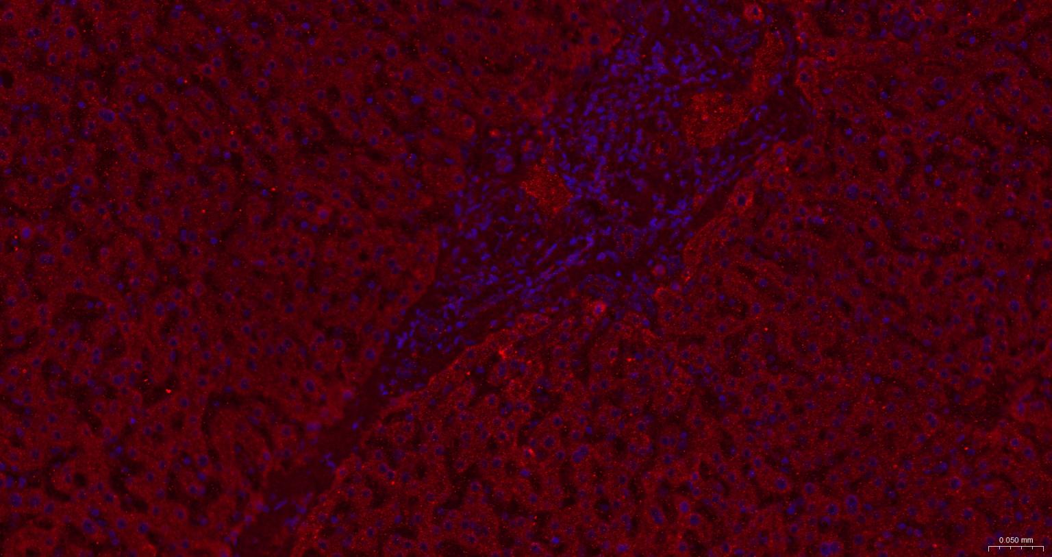 Paraformaldehyde-fixed, paraffin embedded Human Liver; Antigen retrieval by boiling in sodium citrate buffer (pH6.0) for 15 min; The section was incubated with CAMKK2 Polyclonal Antibody, Unconjugated (bs-6253R) at 1:200 overnight at 4°C. Followed by conjugated Goat Anti-Rabbit IgG antibody (Red, bs-0295G-BF594), DAPI (blue, C02-04002) was used to stain the cell nuclei.