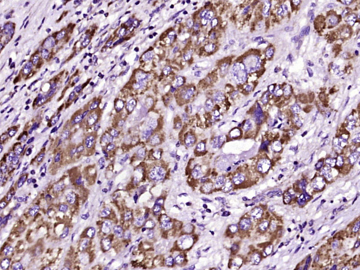 Paraformaldehyde-fixed, paraffin embedded (human liver carcinoma); Antigen retrieval by boiling in sodium citrate buffer (pH6.0) for 15min; Block endogenous peroxidase by 3% hydrogen peroxide for 20 minutes; Blocking buffer (normal goat serum) at 37°C for 30min; Antibody incubation with (MAOA) Polyclonal Antibody, Unconjugated (bs-6679R) at 1:400 overnight at 4°C, followed by operating according to SP Kit(Rabbit) (sp-0023) instructionsand DAB staining.