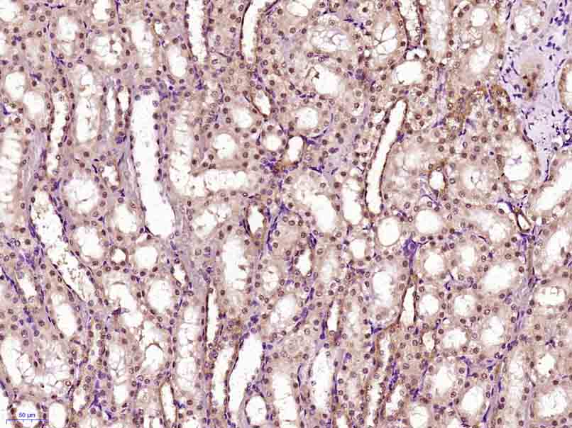 Paraformaldehyde-fixed, paraffin embedded (Rat kidney); Antigen retrieval by boiling in sodium citrate buffer (pH6.0) for 15min; Block endogenous peroxidase by 3% hydrogen peroxide for 20 minutes; Blocking buffer (normal goat serum) at 37°C for 30min; Antibody incubation with (GCMA) Polyclonal Antibody, Unconjugated (bs-6306R) at 1:400 overnight at 4°C, followed by operating according to SP Kit(Rabbit) (sp-0023) instructionsand DAB staining.