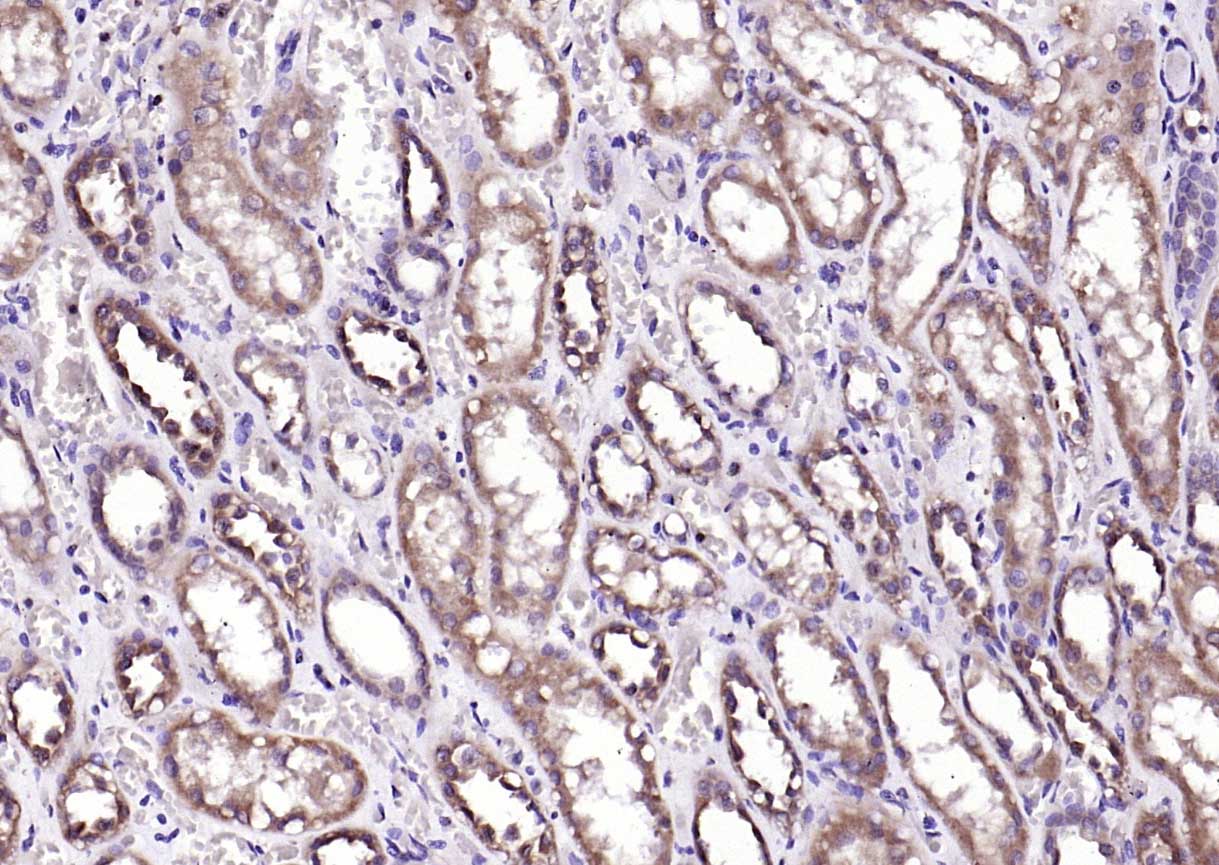 Paraformaldehyde-fixed, paraffin embedded (Human kidney); Antigen retrieval by boiling in sodium citrate buffer (pH6.0) for 15min; Block endogenous peroxidase by 3% hydrogen peroxide for 20 minutes; Blocking buffer (normal goat serum) at 37°C for 30min; Antibody incubation with (Adenylosuccinate Lyase) Polyclonal Antibody, Unconjugated (bs-6352R) at 1:200 overnight at 4°C, followed by operating according to SP Kit(Rabbit) (sp-0023) instructionsand DAB staining.