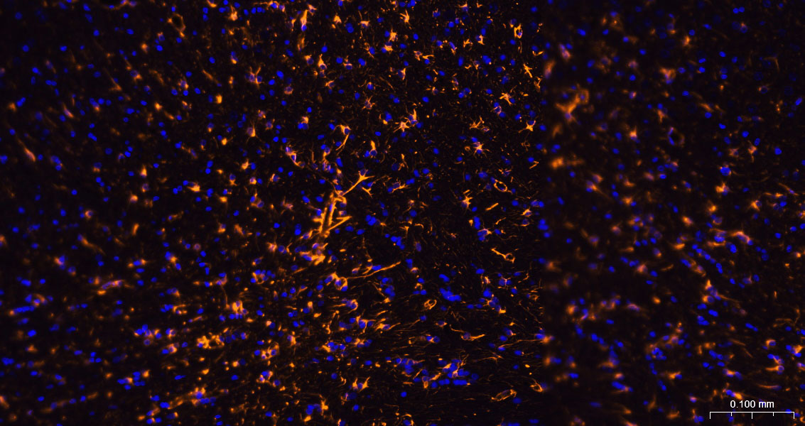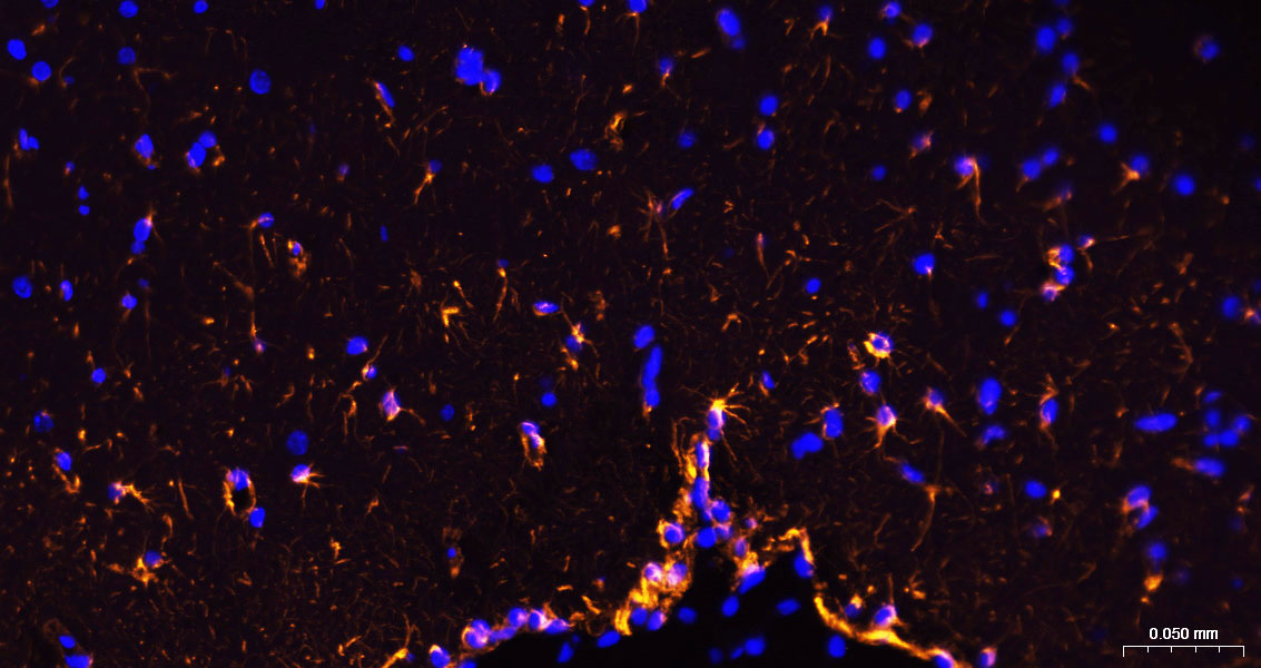 Paraformaldehyde-fixed, paraffin embedded (mouse brain); Antigen retrieval by boiling in sodium citrate buffer (pH6.0) for 15min; Blocking buffer (normal goat serum) at 37°C for 30min; Antibody incubation with (GFAP) Polyclonal Antibody, Unconjugated (bsm-42001R) at 1:200 overnight at 4°C, followed by a conjugated Goat Anti-Rabbit IgG antibody (bs-0295G-BF555) for 90 minutes, and DAPI for nuclei staining.
