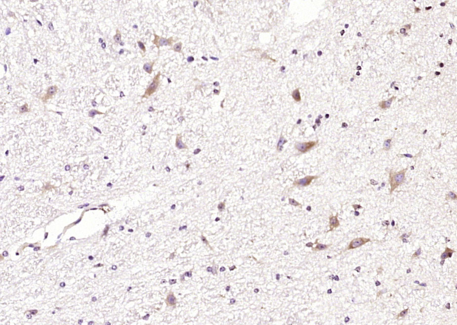 Paraformaldehyde-fixed, paraffin embedded (mouse cerebellum); Antigen retrieval by boiling in sodium citrate buffer (pH6.0) for 15min; Block endogenous peroxidase by 3% hydrogen peroxide for 20 minutes; Blocking buffer (normal goat serum) at 37°C for 30min; Antibody incubation with (CCDC50) Polyclonal Antibody, Unconjugated (bs-6920R) at 1:200 overnight at 4°C, followed by operating according to SP Kit(Rabbit) (sp-0023) instructionsand DAB staining.