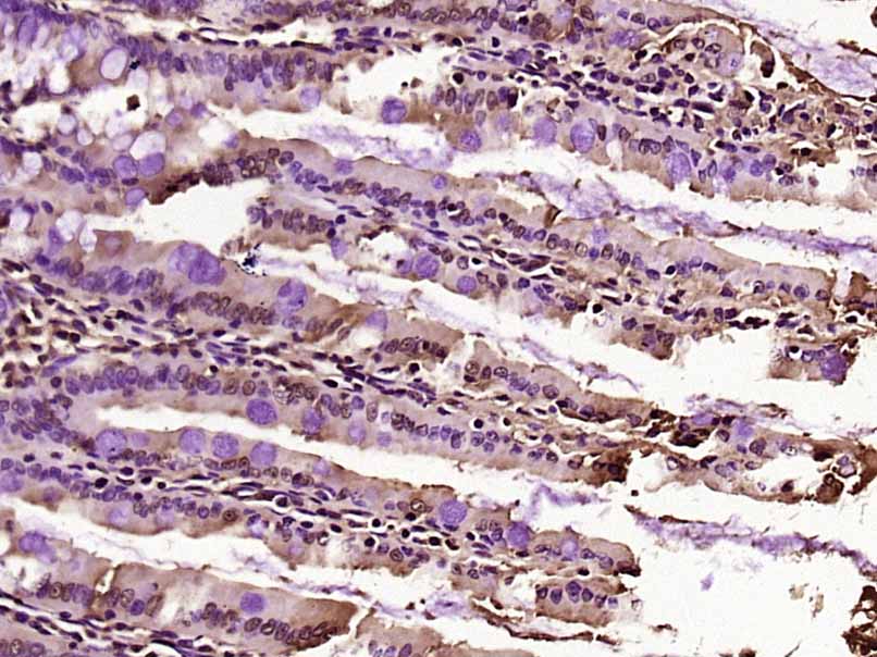 Paraformaldehyde-fixed, paraffin embedded (Mouse small intestine); Antigen retrieval by boiling in sodium citrate buffer (pH6.0) for 15min; Block endogenous peroxidase by 3% hydrogen peroxide for 20 minutes; Blocking buffer (normal goat serum) at 37°C for 30min; Antibody incubation with (CCDC160) Polyclonal Antibody, Unconjugated (bs-8123R) at 1:400 overnight at 4°C, followed by operating according to SP Kit(Rabbit) (sp-0023) instructionsand DAB staining.