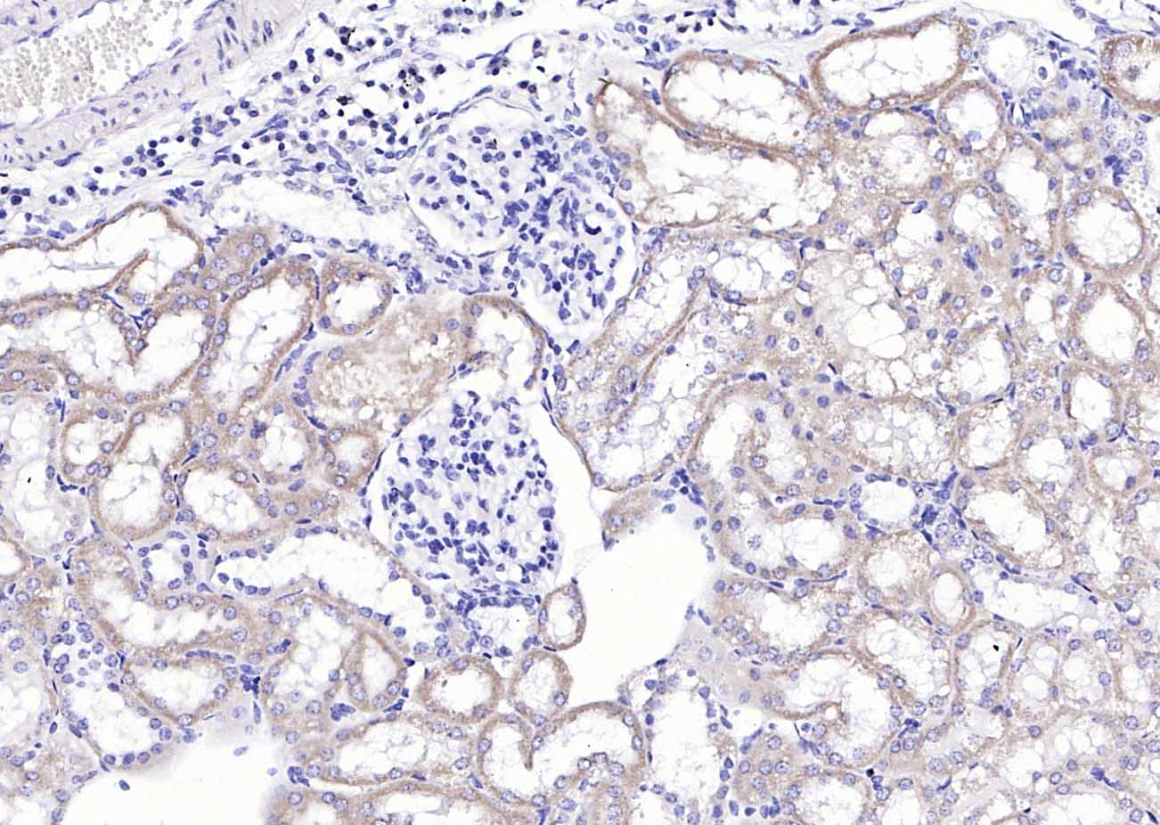 Paraformaldehyde-fixed, paraffin embedded (mouse kidney); Antigen retrieval by boiling in sodium citrate buffer (pH6.0) for 15min; Block endogenous peroxidase by 3% hydrogen peroxide for 20 minutes; Blocking buffer (normal goat serum) at 37°C for 30min; Antibody incubation with (CCDC92) Polyclonal Antibody, Unconjugated (bs-8142R) at 1:200 overnight at 4°C, followed by operating according to SP Kit(Rabbit) (sp-0023) instructionsand DAB staining.