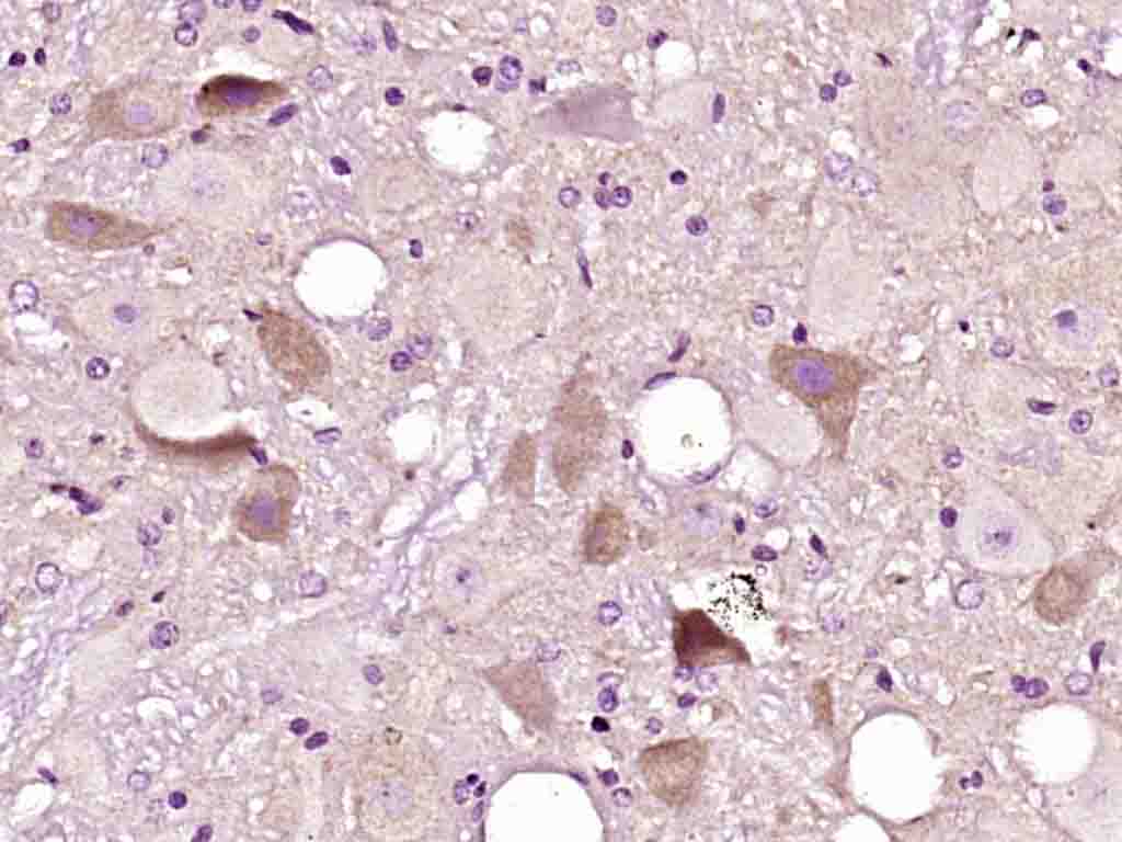 Paraformaldehyde-fixed, paraffin embedded (rat brain); Antigen retrieval by boiling in sodium citrate buffer (pH6.0) for 15min; Block endogenous peroxidase by 3% hydrogen peroxide for 20 minutes; Blocking buffer (normal goat serum) at 37°C for 30min; Antibody incubation with (PANK4) Polyclonal Antibody, Unconjugated (bs-8340R) at 1:200 overnight at 4°C, followed by operating according to SP Kit(Rabbit) (sp-0023) instructionsand DAB staining.