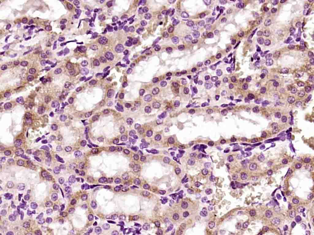 Paraformaldehyde-fixed, paraffin embedded (rat kidney); Antigen retrieval by boiling in sodium citrate buffer (pH6.0) for 15min; Block endogenous peroxidase by 3% hydrogen peroxide for 20 minutes; Blocking buffer (normal goat serum) at 37°C for 30min; Antibody incubation with (PANK4) Polyclonal Antibody, Unconjugated (bs-8340R) at 1:200 overnight at 4°C, followed by operating according to SP Kit(Rabbit) (sp-0023) instructionsand DAB staining.