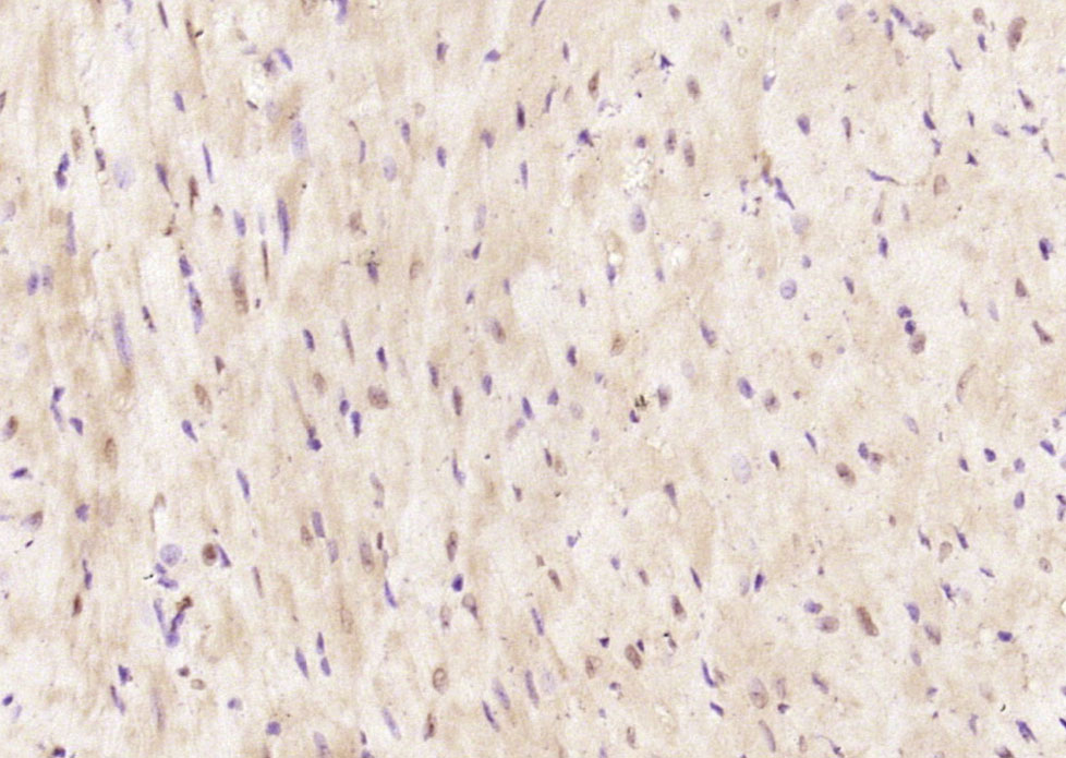 Paraformaldehyde-fixed, paraffin embedded (rat heart); Antigen retrieval by boiling in sodium citrate buffer (pH6.0) for 15min; Block endogenous peroxidase by 3% hydrogen peroxide for 20 minutes; Blocking buffer (normal goat serum) at 37°C for 30min; Antibody incubation with (LRRC2) Polyclonal Antibody, Unconjugated (bs-8360R) at 1:200 overnight at 4°C, followed by operating according to SP Kit(Rabbit) (sp-0023) instructionsand DAB staining.