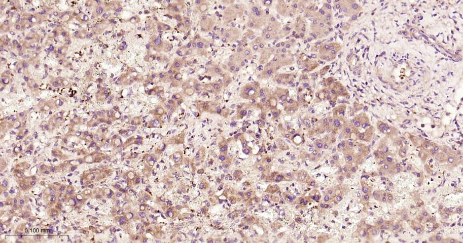 Paraformaldehyde-fixed, paraffin embedded Human Liver Cancer; Antigen retrieval by boiling in sodium citrate buffer (pH6.0) for 15 min; The section was incubated with CFH Polyclonal Antibody, Unconjugated (bs-9525R) at 1:200 overnight at 4°C, followed by conjugation to the bs-0295G-HRP and DAB (C-0010) staining.